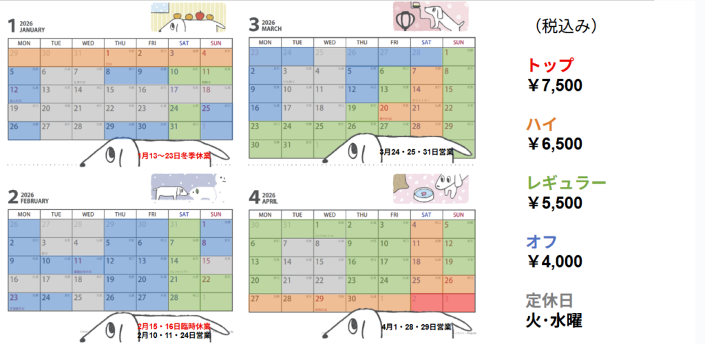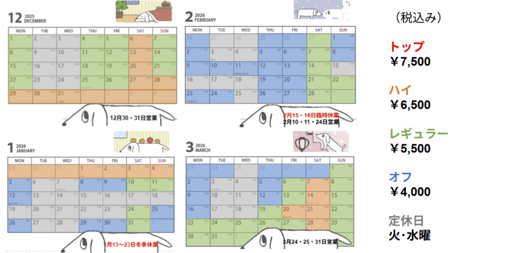 | 料金表 | シーズン変動性 以下のシーズンカレンダーの色と、料金表を照らし合わせてご確認ください。 |